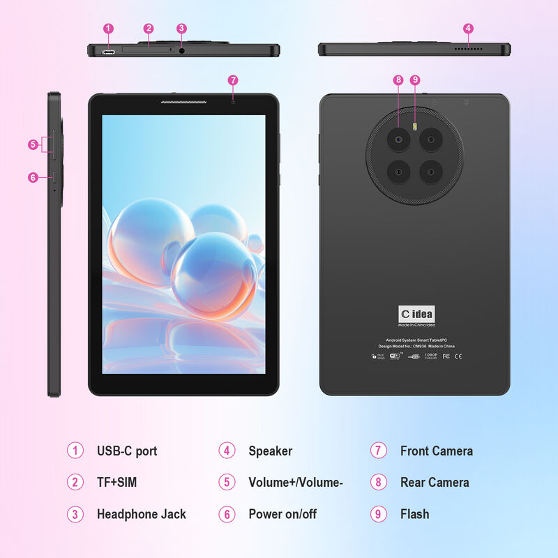 C 아이디어 9인치 안드로이드 16 태블릿 8GB 램 512GB 롬 모델 CM936